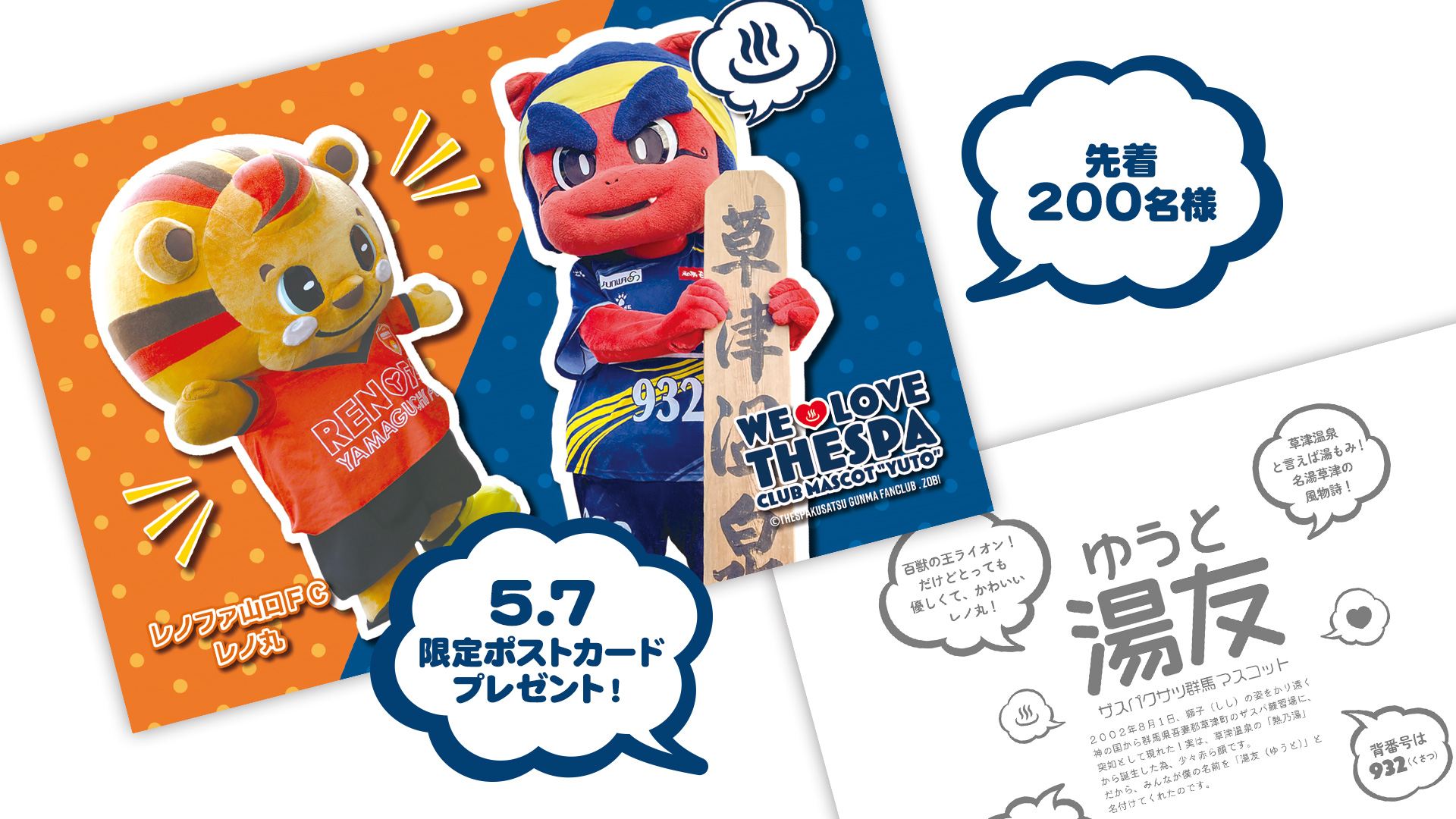 ホーム戦となる、5月7日(日)「ザスパクサツ群馬 VS レノファ山口FC」戦(正田醤油スタジアム群馬・14:00キックオフ)では、ファンクラブブースにて会員様対象に限定ポストカードを先着200名様にプレゼント!