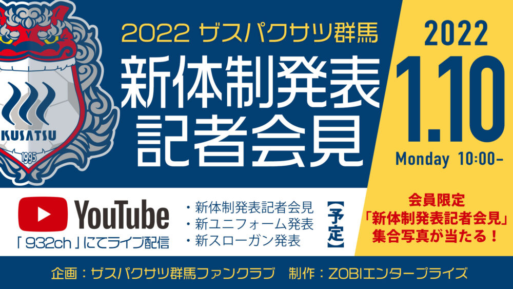 【932ch-Live】1月10日(月祝)「2022ザスパクサツ群馬新体制発表記者会見」配信!
