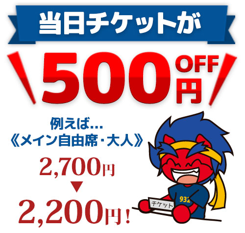 ホーム戦会場にて、ファンクラブ会員証を提示すると「当日チケットが最大500円」割引で購入できます。※ホーム戦会場にて、入会登録者のみ1試合1枚まで割引。購入時には会員証が必要です。