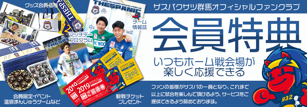 ザスパクサツ群馬ではファンの皆様がザスパの一員となり、これまで以上に試合を楽しんで頂けるよう、また盛りだくさんのサービスをご提供できるよう努めております。年3回無料発送のチーム情報誌「THESPANIC」や会員割引制度、会員限定イベント、その他イベント、オフィシャル応援ツアー割引などなど様々な会員特典もございます。