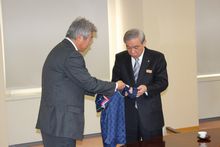 ザスパクサツ群馬から、「鶴舞う形の群馬県」の群馬県の形をあらわしたデザインの、新ユニフォームを贈呈。